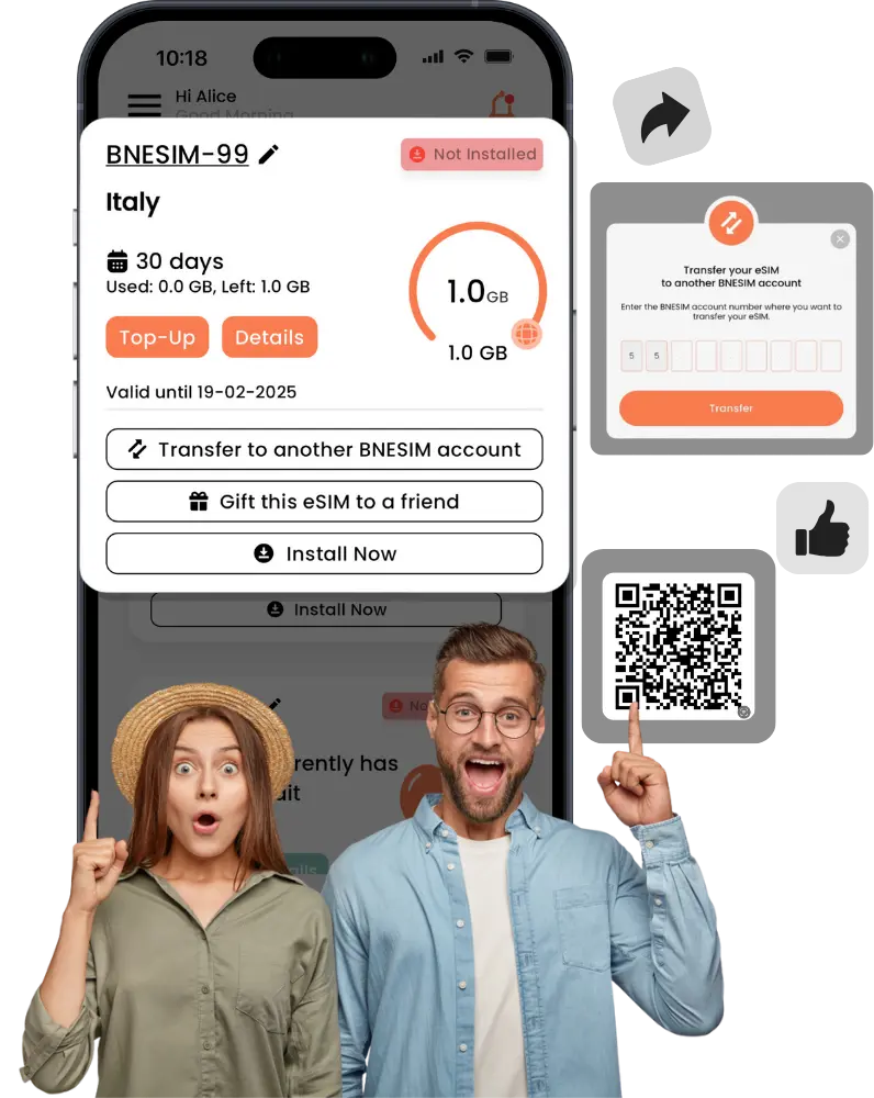 Lorsque vous recevez une eSIM par QR code, vous pouvez l'installer directement sans l'application. Cependant, pour gérer entièrement votre eSIM, téléchargez l'app BNESIM. En créant un compte, votre eSIM offerte apparaîtra automatiquement, vous permettant de vérifier votre solde, suivre votre utilisation, recharger et accéder à toutes les fonctionnalités de contrôle.