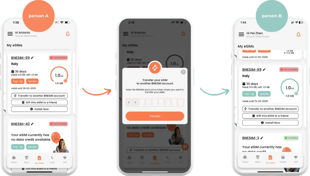 Transférez facilement une eSIM vers un autre compte BNESIM pour une utilisation immédiate.
