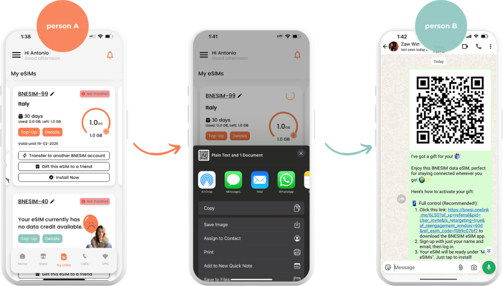 Cliquez sur « Offrir cette eSIM à un ami » et partagez le QR code. Le destinataire peut scanner pour activer instantanément, ou télécharger l'app BNESIM pour gérer son eSIM offerte avec un contrôle total.